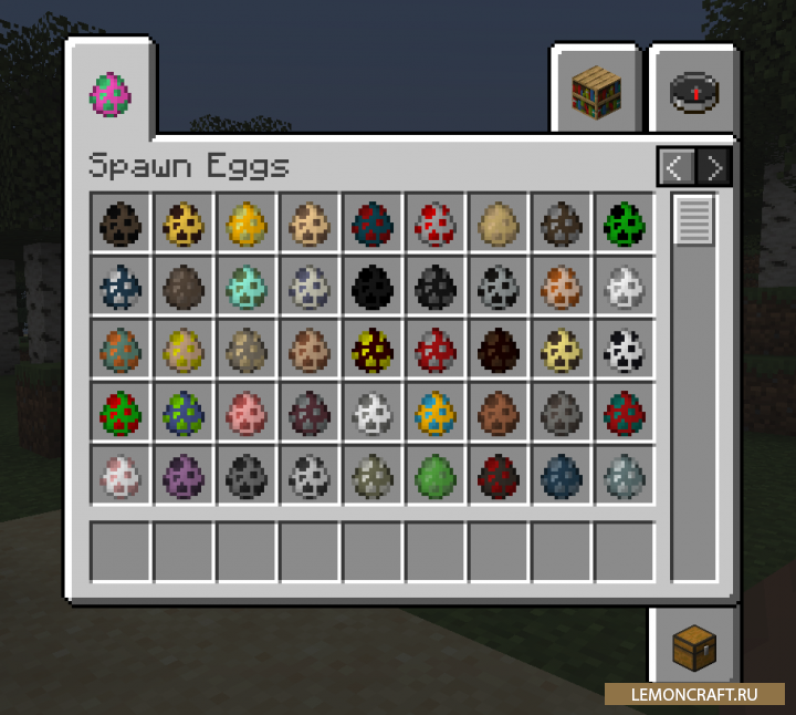 Мод на отдельную вкладку для яиц призыва Egg Tab небольшая, но довольно полезная модификация, которая добавляет в игру отдельную вкладку в меню творческого режима для яиц призыва. С этим модом игровой процесс станет более комфортным.